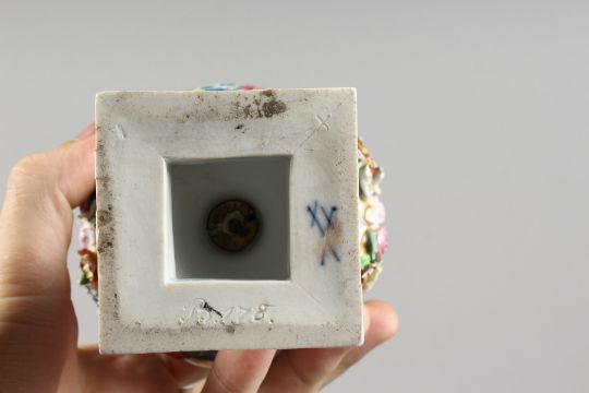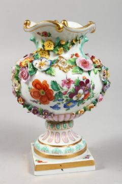 A GOOD 19TH CENTURY MEISSEN FLOWER ENCRUSTED URN painted with flowers on a square base.