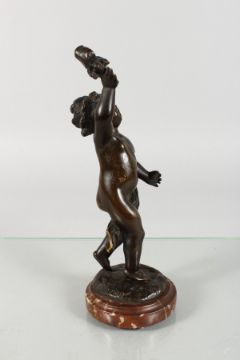 CLODION (1738-1814) FRENCH. A small bronze figure of a semi-nude cherub holding aloift a Jester's rattle in his right hand, mounted on a rouge marble circular base.