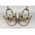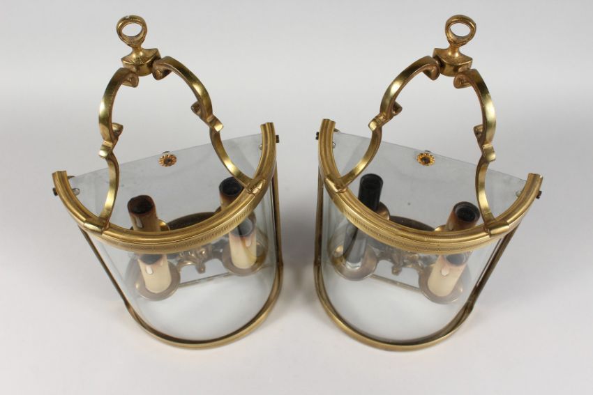 A PAIR OF BRASS AND GLASS BOWFRONT TWIN BRANCH ELECTRIC WALL LIGHTS.