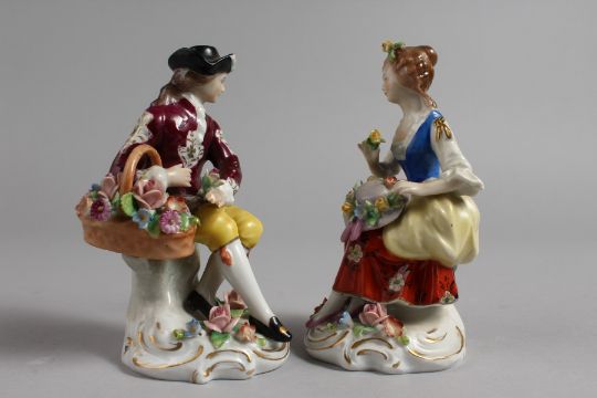 A PAIR OF SITZENDORF FIGURES, a seated man with basket of flowers, and a seated girl with a flower in her hand. 5ins high.