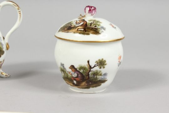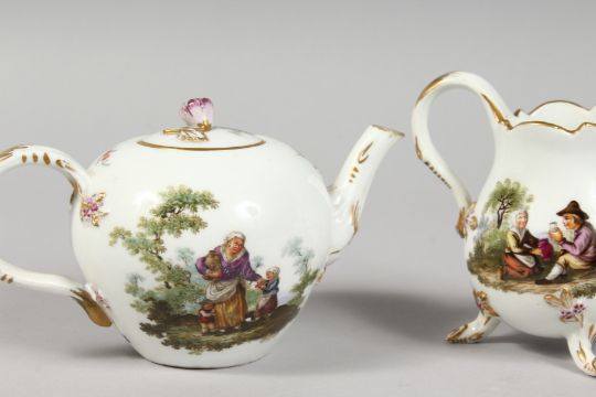 A SUPERB 18TH CENTURY MEISSEN PORCELAIN FOUR PIECE CABARET SET, with oval tray, teapot and cover, sugar bowl and cover, milk jug, painted with rural scenes, the tray 12ins long.