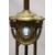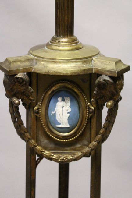 A CLASSICAL ADAM REVIVAL BRASS FLOOR STANDING LAMP, with reeded upper column, ram's head and leaf swag mounts, jasperware panels on three curving legs united by an urn finial.