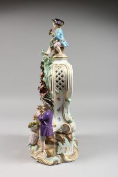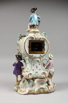 A SUPERB 19TH CENTURY MEISSEN PORCELAIN CLOCK encrusted with flowers and four figures and scrolls in gilt. Cross swords mark in blue. Incised no. E19.