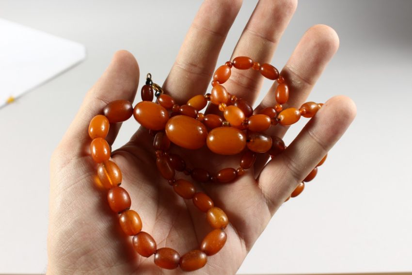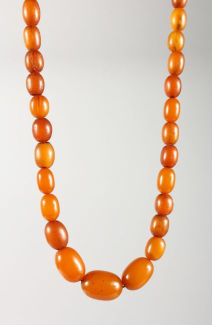 A VERY GOOD STRING OF AMBER BEADS.