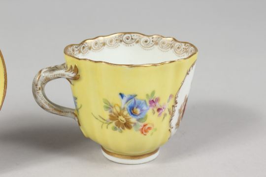 A 19TH CENTURY MEISSEN YELLOW GROUND CABARET CUP AND SAUCER crested and painted with flowers. Crossed sword marks in blue.