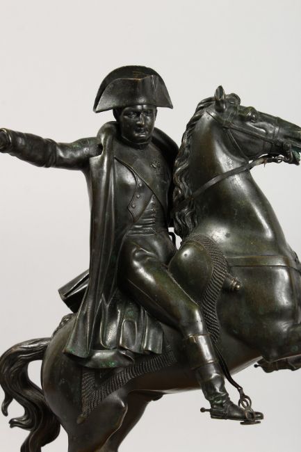 A VERY GOOD 19TH CENTURY FRENCH BRONZE AND MARBLE "NAPOLEON" CLOCK, the top with a figure of Napoleon on his horse, the clock with eight day movement and single bell.