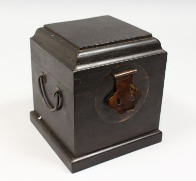 A CHINESE HARDWOOD SQUARE BOX with a hinged lid. 6.5ins wide.