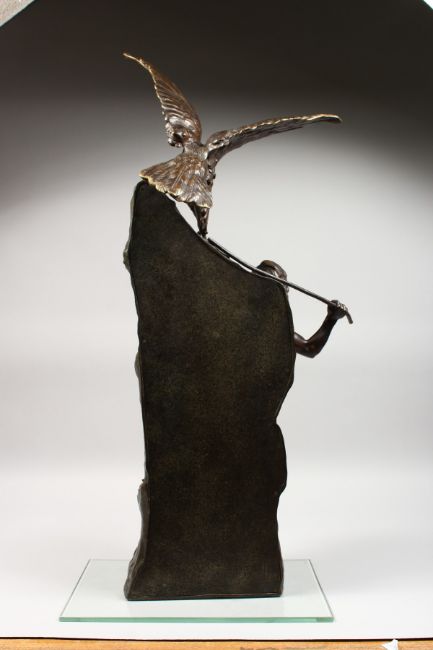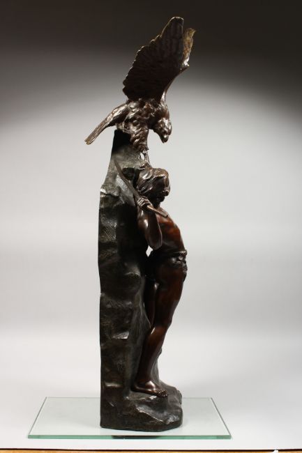 THEOPHILE FRANCOIS SOMME (FRENCH) 1871-1952.A superb bronze figure of an Eagle Slayer."Denicheur D'Aigles". The young warrior with a staff, the eagle above with outstretched wings.Bears plaque par Th. Somme (Salon des Beaux Arts 1899). 36ins high.