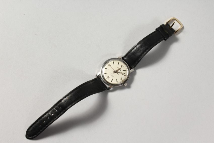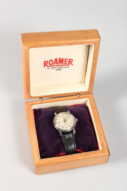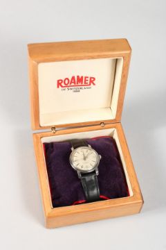 A GENTLEMAN'S ROAMER WRISTWATCH in a wooden box with leather strap.
