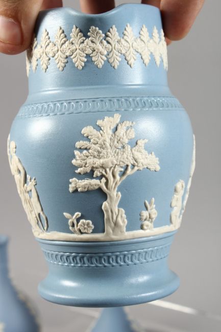 A COLLECTION OF SIXTEEN PIECES OF PALE BLUE AND WHITE JASPER WARE BOTTLES.