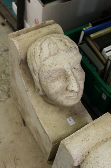 A large reconstituted stone human head corbel.