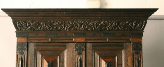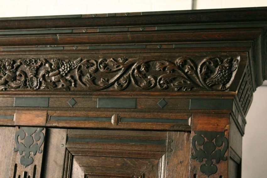 A GOOD 17TH CENTURY FLEMISH OAK TWO DOOR CUPBOARD, with moulded oak leaf carved cornice, a pair of panelled doors with fluted centre panel and pair of fluted panels to each side, all with ebonised decoration on three leaves, turned and ebonised front feet.