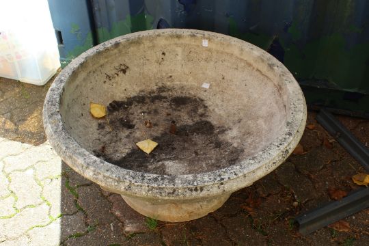 A large circular pedestal reconstituted stone garden urn.