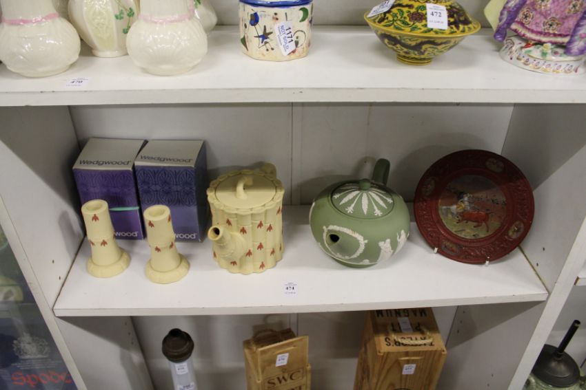 Wedgwood and other items to include a green Jasper ware teapot, a faux bamboo teapot with a pair of similar candlesticks etc.