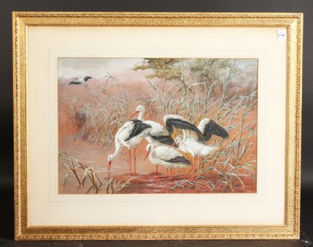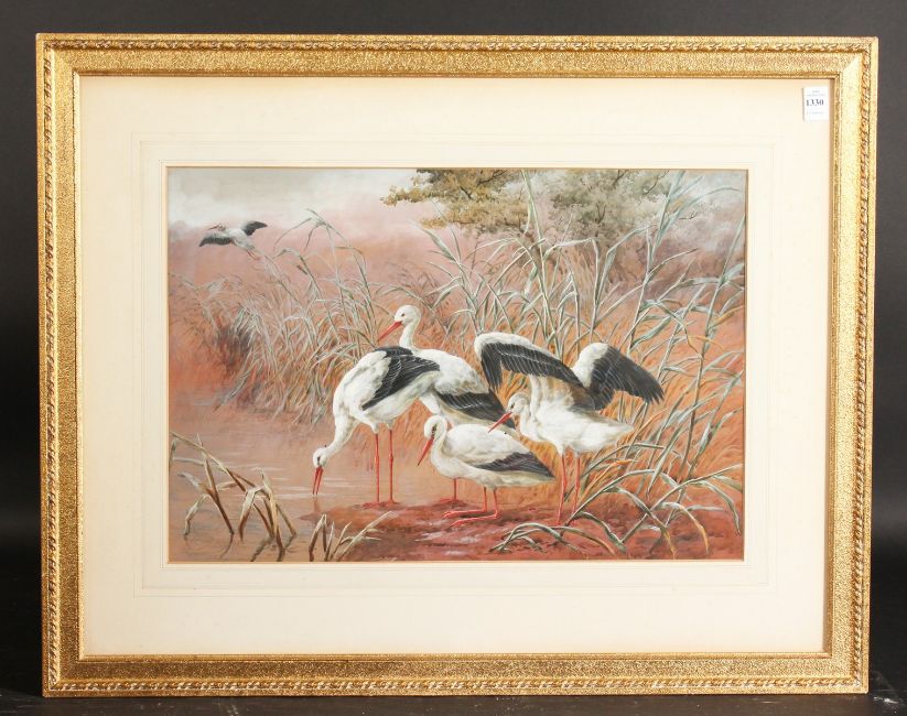 Harry Bright (1846-1895) British. Storks in a Landscape, Watercolour, Signed. 14" x 21". Provenance: The Ravensbourne Galleries.