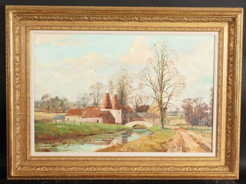 Marcus Ford (1915-1989) British. 'Near Cranbrook', River Landscape with Oast Houses, Oil on Canvas, Signed and Inscribed Verso. 20" x 30".