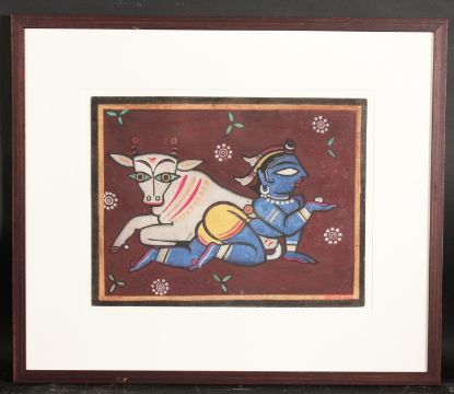 Jamini Roy (1887-1972) Indian. Blue Figure with Cow, Gouache on Board, Signed, 13.5" x 18". Provenance: Purchased directly from the artist by the vendor's grandfather.
