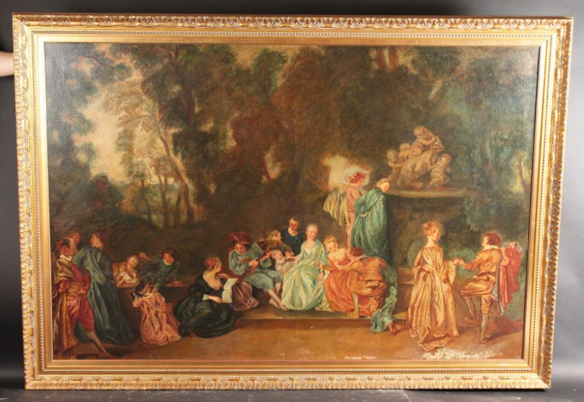 19th Century European School. Figures gathered in a Country House Garden, Oil on Canvas. 43" x 63".