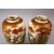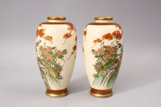 A GOOD PAIR OF JAPANESE MEIJI PERIOD CERAMIC VASES, each vase upon a beige ground with typical orange and gilt decoration of trees and foliage surrounding the main section of peacocks in landscape settings, the bases bearing red seal marks, 22cm high.