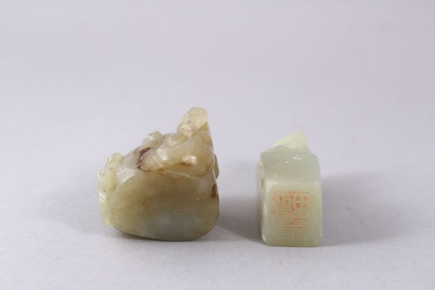 TWO 19TH CENTURY CHINESE CARVED JADE FIGURE & SEAL, the figure carved depicting a leopard upon a rock, 3cm, the other of a carved seal in the form of a hare, the base carved, 5cm