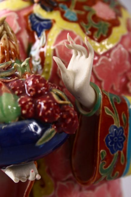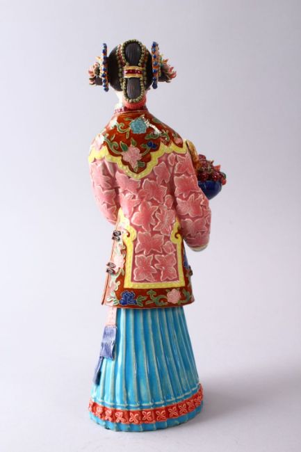 A CHINESE FAMILLE ROSE POTTERY FIGURE OF A LADY HOLDING FLORA, the underside with calligraphy and seal marks, 31cm high.