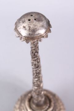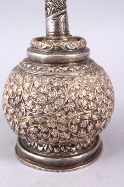 A GOOD 18TH / 19TH CENTURY INDIAN SILVER ROSE WATER SPRINKLER, with formal scrolling foliage, 29cm.