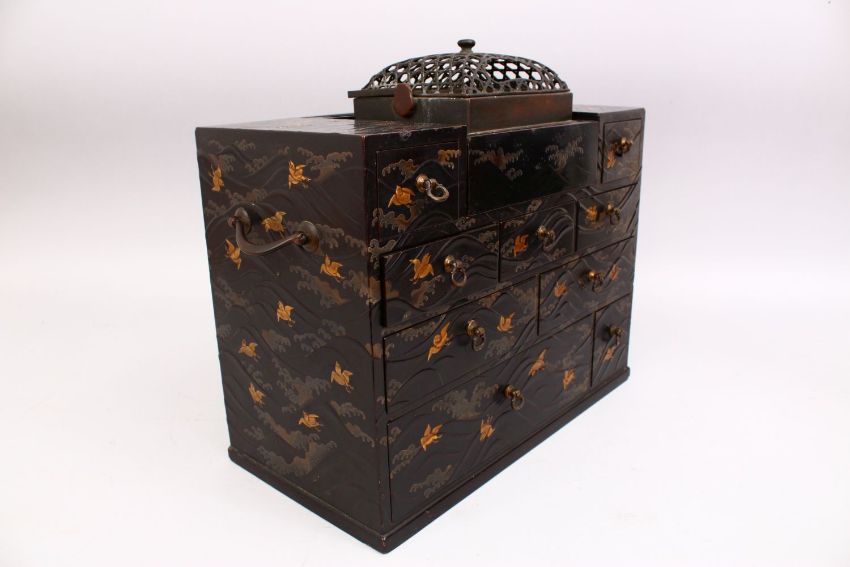 A GOOD JAPANESE MEIJI PERIOD LACQUER CABINET / BOX, The body decorated with raised wave design and gilt birds, the top with koro section, with 9 drawers, 34cm x 37cm.