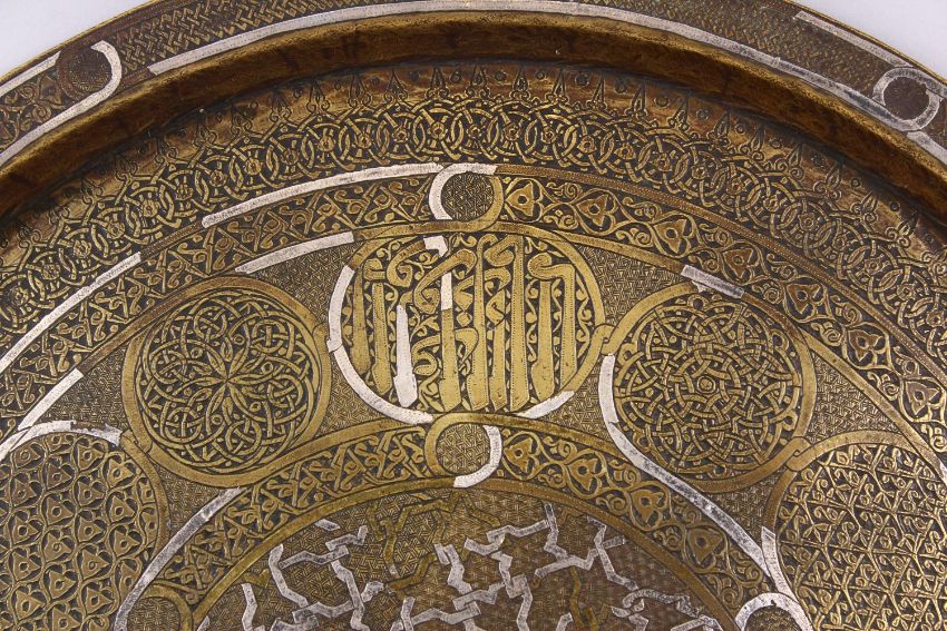 A FINE 19TH CENTURY OR EARLIER SILVER INLAID BRASS DAMASCUS TRAY, with roundel's of decoration and calligraphy, 39cm diamter.