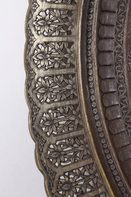 A LARGE PERSIAN TINNED COPPER TRAY, MID 20TH CENTURY, engraved a radiating palmette design, within a pierced border, 77cm diameter.