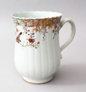 A GOOD 18TH CENTURY CHINESE QIANLONG FAMILLE ROSE PORCELAIN TANKARD, the body of the moulded tankard decorated with scenes of native floral borders, 16cm high x 16cm wide.