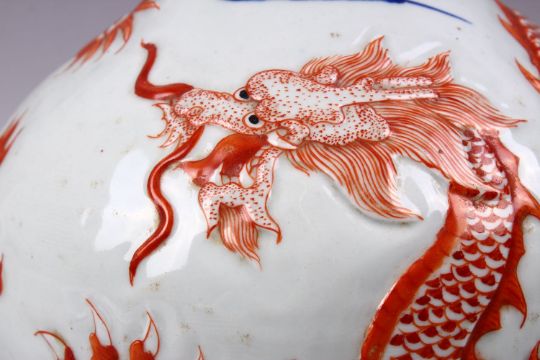 A LARGE 19TH / 20TH CENTURY CHINESE IRON RED & UNDERGLAZE BLUE DRAGON PORCELAIN BOTTLE VASE, with an intertwining dragon amongst clouds, the base with a six character yongzheng mark. 34cm.