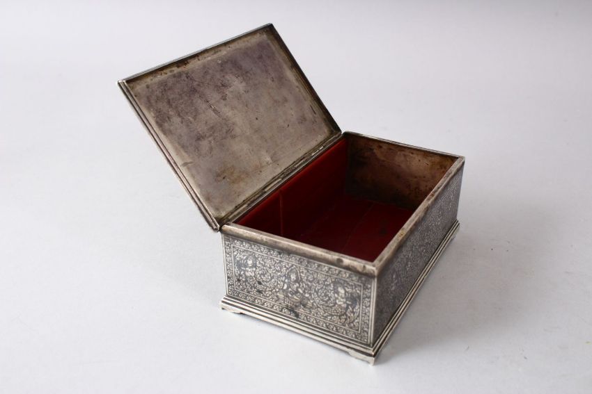 A 19TH CENTURY THAI NIELLO SILVER INLAID BOX, with figure and scroll decoration and a wooden liner, 13cm x 8cm