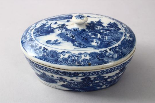 A GOOD 18TH CENTURY CHINESE QIANLONG BLUE & WHITE PORCELAIN BUTTER DISH & COVER & STAND, The body of the three pieces each displaying a typical native landscape view, 8.5cm high x 16.5cm wide x 14cm deep.