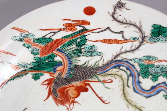 A GOOD CHINESE KANGXI STYLE WUCAI PORCELAIN DRAGON DISH, decorated with dragon and phoenix amongst clouds and foliage, the base with a six character mark. 29cm dia