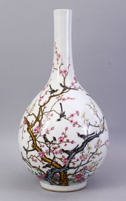 A GOOD CHINESE REPUBLIC FAMILLE ROSE PORCELAIN BOTTLE VASE, decorated with birds and trees, the base with a qianlong mark, 39cm.