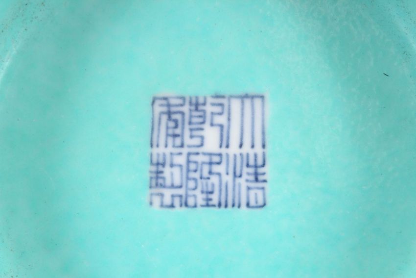 A CHINESE IRON RED & TURQUOISE PORCELAIN MOULDED BOWL, with iron red decorated dragons with green wave design, the interior and base wioth turquoise glaze and bearing a six character qianlong mark, 22cm