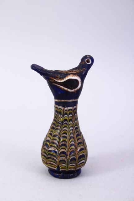 A GOOD MAMLUK MARVERED GLASS MINIATURE BIRD VASE / CONTAINER, 8cm.