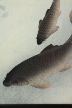 A GOOD EARLY - MID 20TH CENTURY JAPANESE WOODBLOCK PRINT OF SWIMMING CARP BY KOSON, framed 37cm x 25cm.