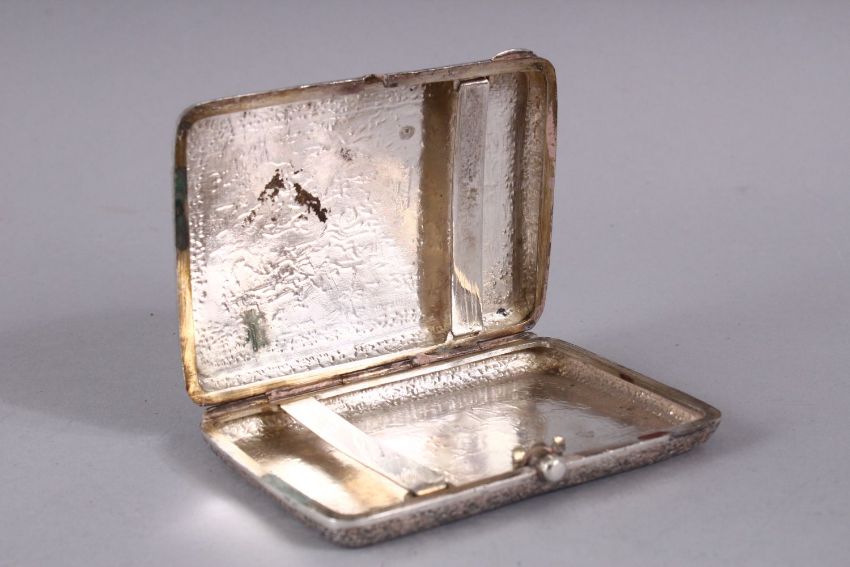 A FINE 19TH CENTURY PERSIAN QAJAR SILVER CHASED CIGARETTE CASE, with finely chased hunting scenes, 9cm x 6cm