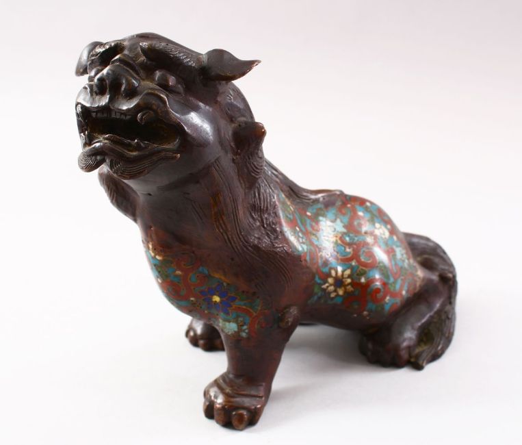 A 19TH CENTURY CHINESE BRONZE & CLOISONNE MODEL OF A LION DOG, the dog in a seated position bearing its teeth, the body decorated in cloisonne work to depict formal scrolling flora, 20cm high x 27cm wide x 11cm deep