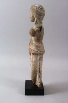 A RARE AND LARGE 2ND CENTURY BC INDIAN CLAY FIGURE OF A MOTHER, stood originally holding a child, mounted upon a stand, the stone 30cm high x 12cm wide.