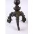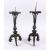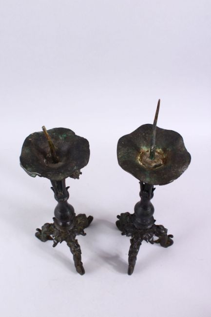 A PAIR OF CHINESE MING BRONZE ALTER / CANDLE STICKS, with lotus form base, on three lion dog moulded feet, 38cm high.