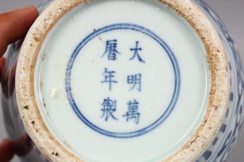 A GOOD CHINESE BLUE & WHITE PORCELAIN VASE, decorated with lion dog decoration upon formal scroll, the base with a six character mark to base, 18cm.