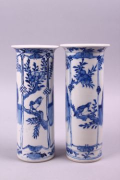 A PAIR OF CHINESE KANGXI BLUE & WHITE PORCELAIN SLEEVE VASES, both decorated with scenes of figures and birds in landscapes, bearing fouor character kangxi marks to bases, one af, 20.5cm high.