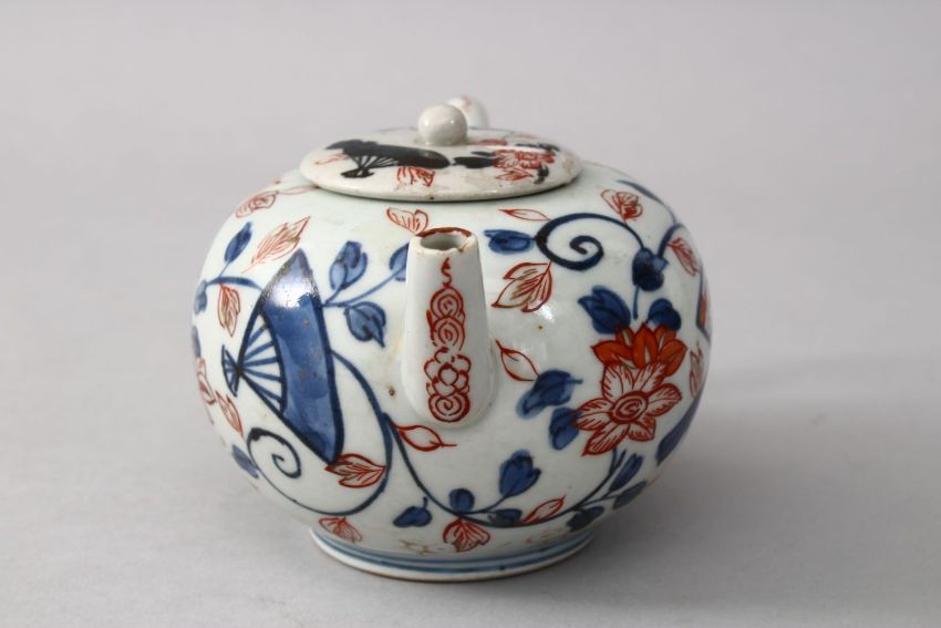 A GOOD 19TH CENTURY CHINESE IMARI PORCELAIN TEAPOT & COVER, decorated with underglaze blue decoration with fans and foliage with iron red decor of leaves, 8cm high x 16cm wide.