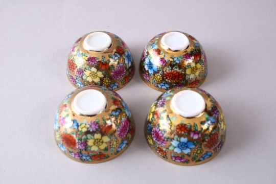 FOUR CHINESE REPUBLIC STYLE PORCELAIN CUPS IN BOX, decorated upon a gilt ground with flora and butterflies, 4.5cm.