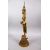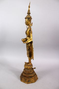 A GOOD 18TH CENTURY GILT BRONZE FIGURE OF BUDDHA / DEITY, in a standing position holding a bowl, stood upon a moulded pedestal, gilded with traces of red lacquer, 51cm high x 13cm wide.