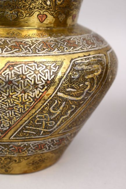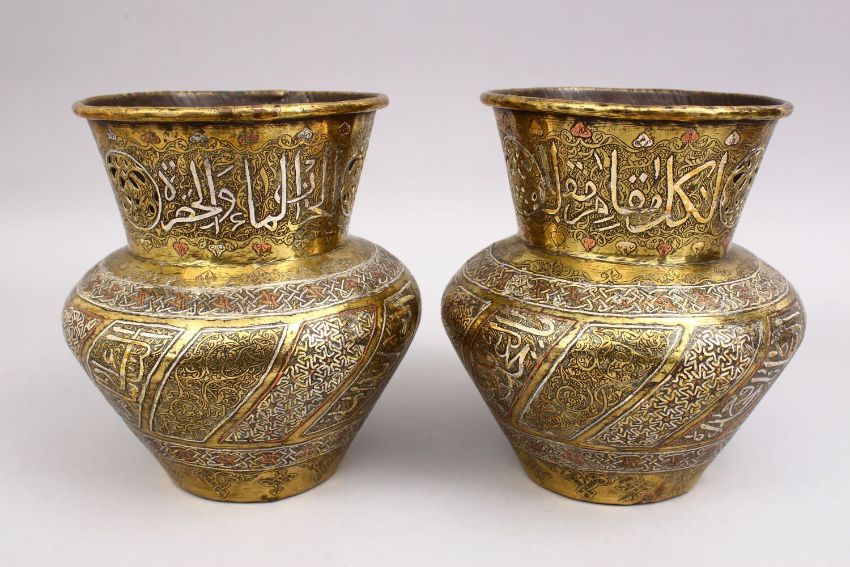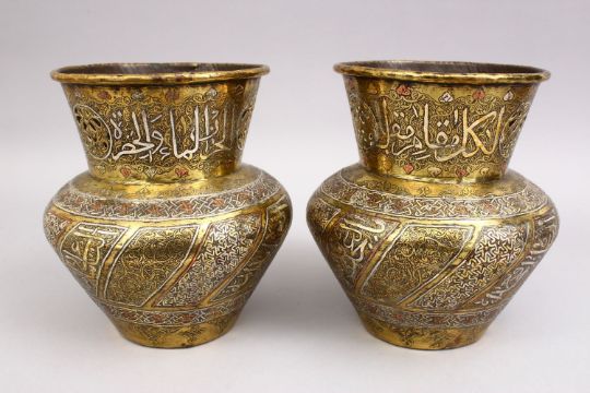 A GOOD PAIR OF 19TH CENTURY DAMASCUS INLAID CALLIGRAPHIC VASES, both engraved with calligraphy and borders of geometric form, 21cm high .