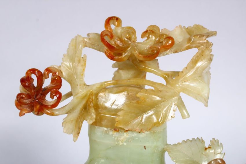 A GOOD 19TH CENTURY CHINESE CARVED JADE VASE AND COVER, the vase with carved detailed flora and foliage, the lid with similar decoration, 24cm high x 15cm wide.