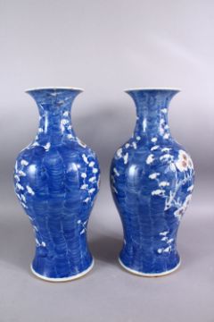 A PAIR OF 19TH CENTURY CHINESE BLUE & WHITE PORCELAIN PRUNUS VASES, each with prunus decoration, the bases with six character kangxi marks. 46cm high (af)